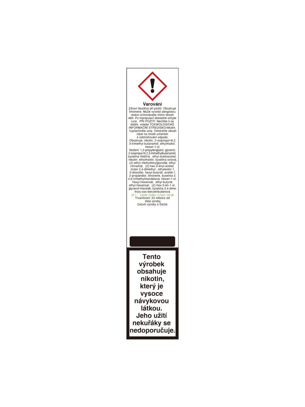 Složení: 1,2-propylenglykol, glycerol, triacetin, kyselina mléčná, nikotin, 2-isopropyl-N,2,3-trime-thylbutanamid, ethylmaltol, dekan-4-olid, kyselina octová, ethylbutyrat, limonene, maltol, oktán-4-olid, alyl-3-cyklohexylpropanoát, 2-(4-methyl cyklohex-3-enyl) propan-2-ol, 2-(4-methyl cyklohex-3-enyl) propan-2-ol, linalool, oktán-4-olid, ethylkrotonát, butyl-acetát, isoamyl-acetát