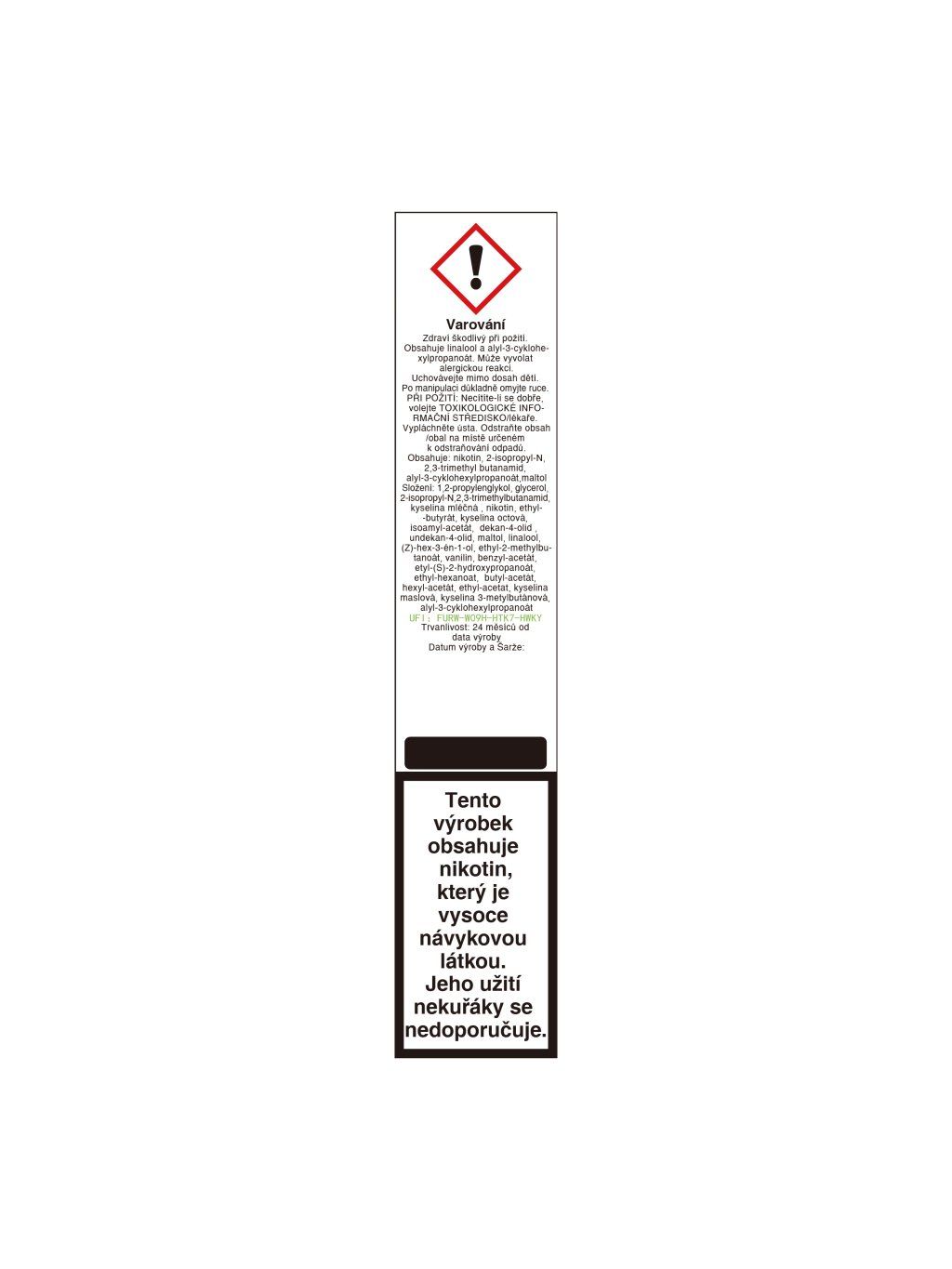 Složení: 1,2-propylenglykol, glycerol, triacetin, kyselina mléčná, nikotin, 2-isopropyl-N,2,3-trime-thylbutanamid, ethylmaltol, dekan-4-olid, kyselina octová, ethylbutyrat, limonene, maltol, oktán-4-olid, alyl-3-cyklohexylpropanoát, 2-(4-methyl cyklohex-3-enyl) propan-2-ol, 2-(4-methyl cyklohex-3-enyl) propan-2-ol, linalool, oktán-4-olid, ethylkrotonát, butyl-acetát, isoamyl-acetát