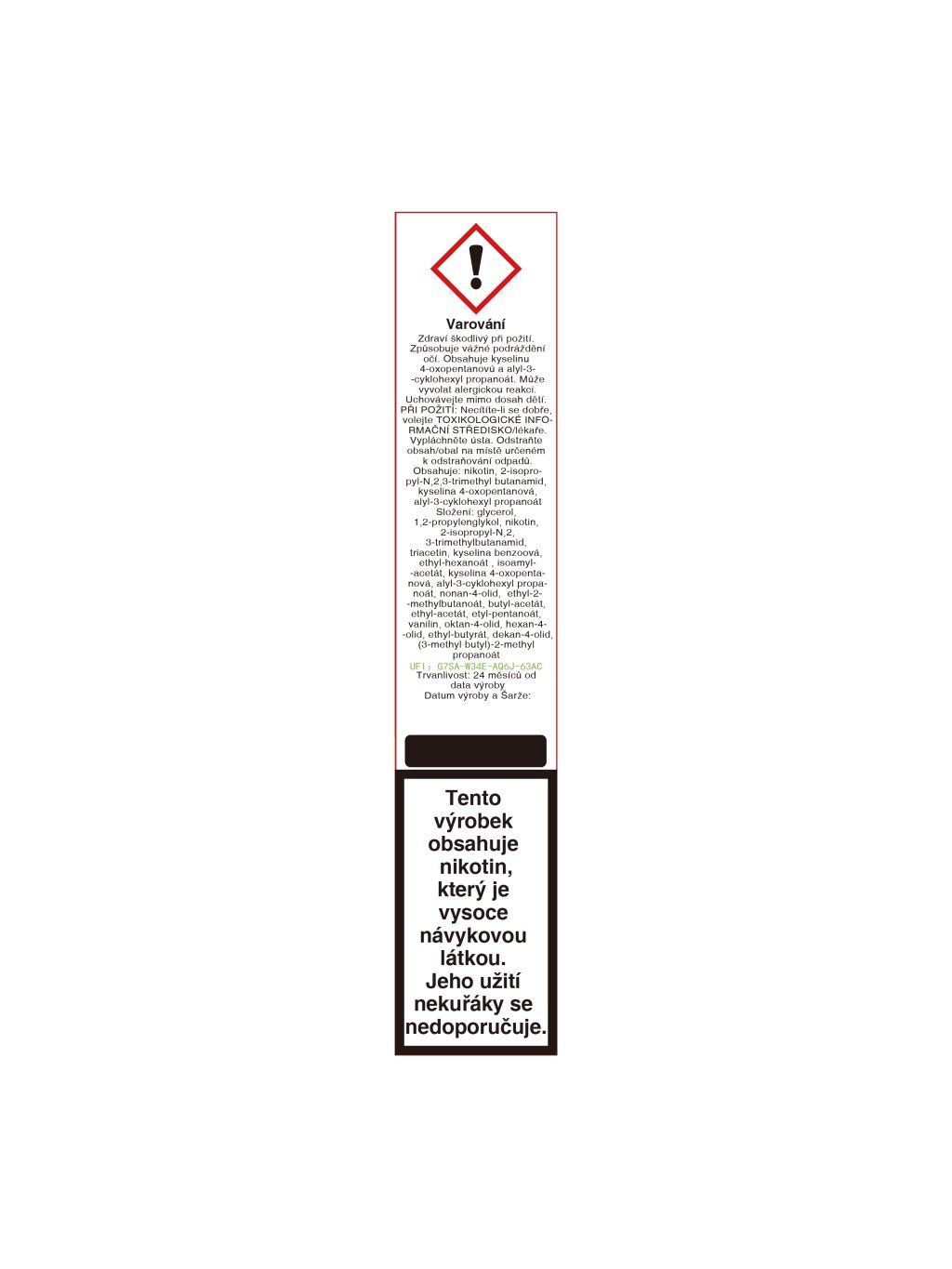 Složení: 1,2-propylenglykol, glycerol, triacetin, kyselina mléčná, nikotin, 2-isopropyl-N,2,3-trime-thylbutanamid, ethylmaltol, dekan-4-olid, kyselina octová, ethylbutyrat, limonene, maltol, oktán-4-olid, alyl-3-cyklohexylpropanoát, 2-(4-methyl cyklohex-3-enyl) propan-2-ol, 2-(4-methyl cyklohex-3-enyl) propan-2-ol, linalool, oktán-4-olid, ethylkrotonát, butyl-acetát, isoamyl-acetát